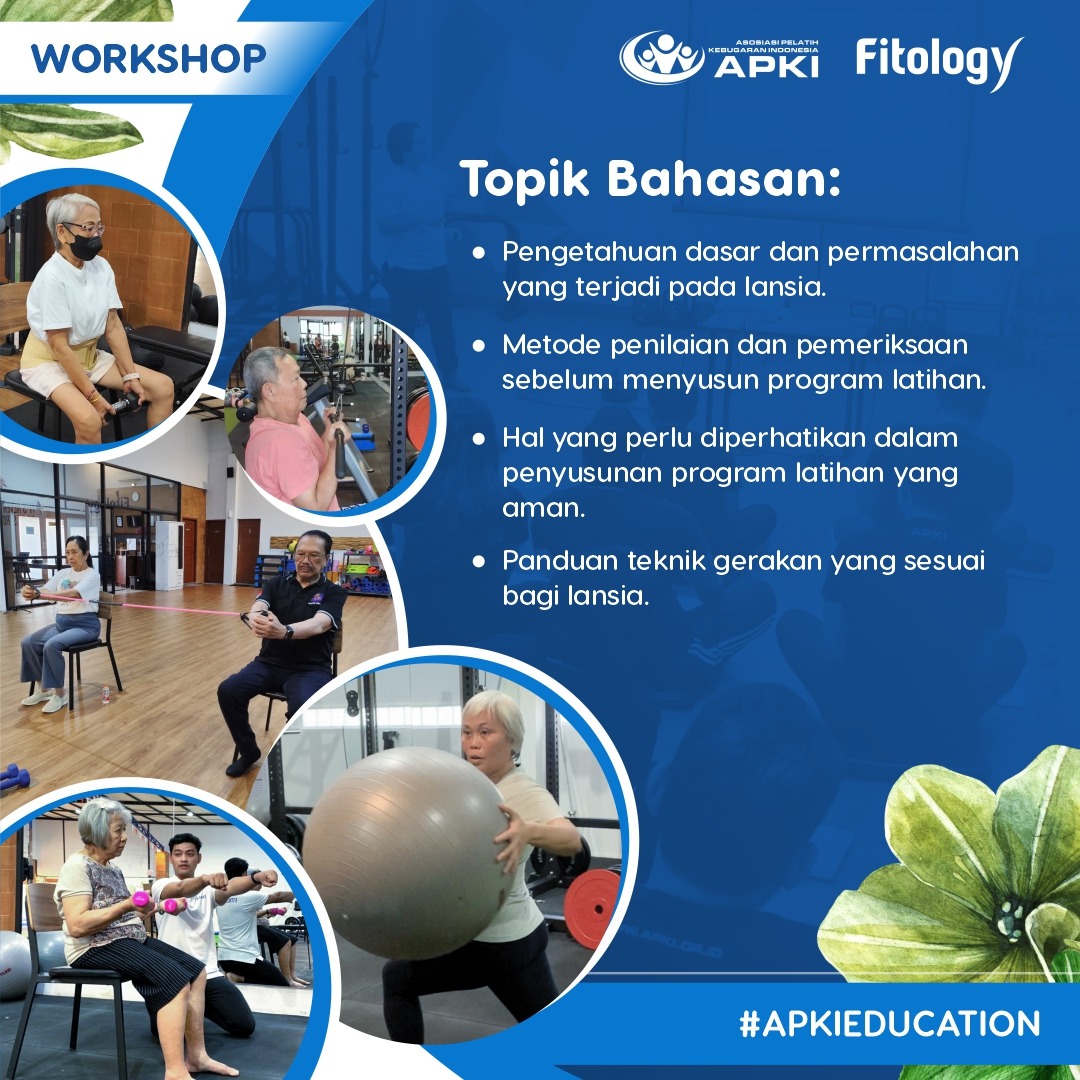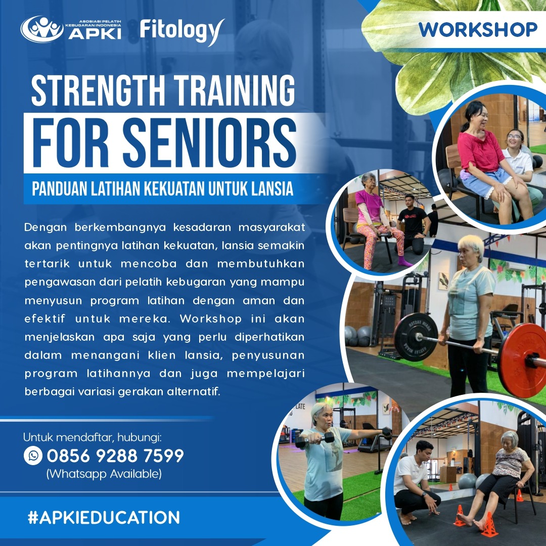 Dengan berkembangnya kesadaran masyarakat akan pentingnya latihan kekuatan, lansia semakin tertarik untuk mencoba dan membutuhkan pengawasan dari pelatih kebugaran yang mampu menyusun program latihan dengan aman dan efektif untuk mereka. Workshop ini akan menjelaskan apa saja yang perlu diperhatikan dalam menangani klien lansia, penyusunan program latihannya dan juga mempelajari berbagai variasi gerakan alternatif.